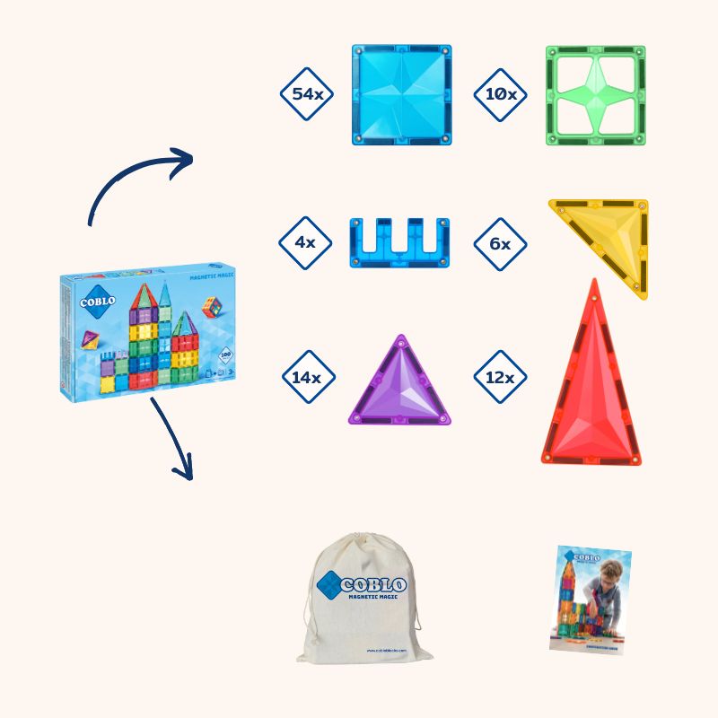 Deze 100 stuks verpakking bevat 100 magnetische bouwblokken in verschillende vormen en kleuren. Door de magneetjes in de stenen klik je de blokken makkelijk aan elkaar. Deze set is voor kinderen die het uiterste uit Coblo willen halen en zoveel mogelijk grote bouwwerken willen bouwen.