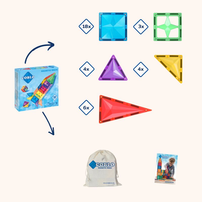 Deze 35 stuks verpakking bevat 35 magnetische bouwblokken in verschillende vormen en kleuren, die kinderen, door de magneetjes in de stenen, makkelijk aan elkaar klikken. Ze bouwen iedere keer wat anders en hebben geen hulp nodig, wat ze extra trots maakt.