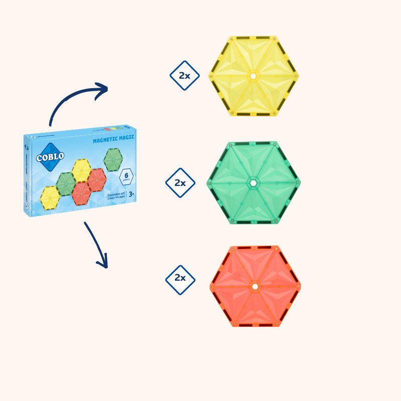 Deze uitbreidingsset bestaat uit 6 magnetische zeshoeken in verschillende kleuren, te combineren met de basissets classic. Door de magneten in de stenen kunnen kinderen deze makkelijk zelf aan elkaar klikken en nog gavere bouwwerken maken. Deze uitbreiding zorgt voor nog meer plezier.