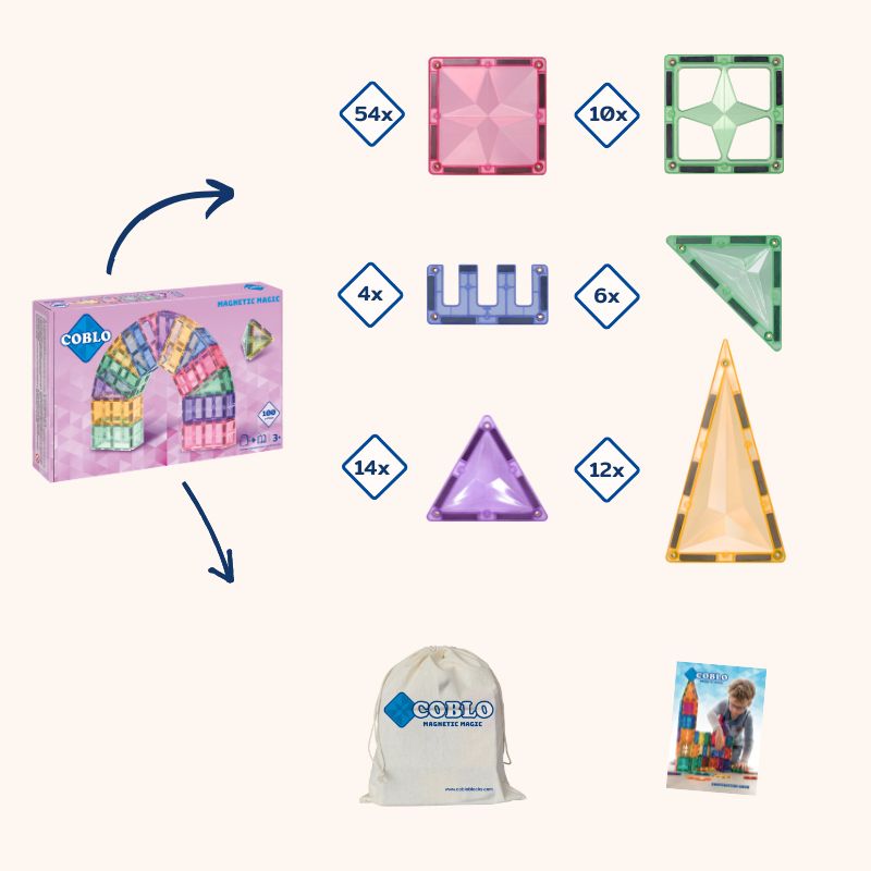 Deze 100 stuks verpakking bevat 100 magnetische bouwblokken in pastel kleuren. Mooie, zachte tinten die voor een geheel andere uitstraling zorgen dan de classic stenen. Door de magneetjes in de stenen klik je de blokken makkelijk aan elkaar. Deze set is voor kinderen die het uiterste uit Coblo willen halen en zoveel mogelijk grote bouwwerken willen bouwen. Laat de fantasiewereld van kinderen in pastel kleuren!