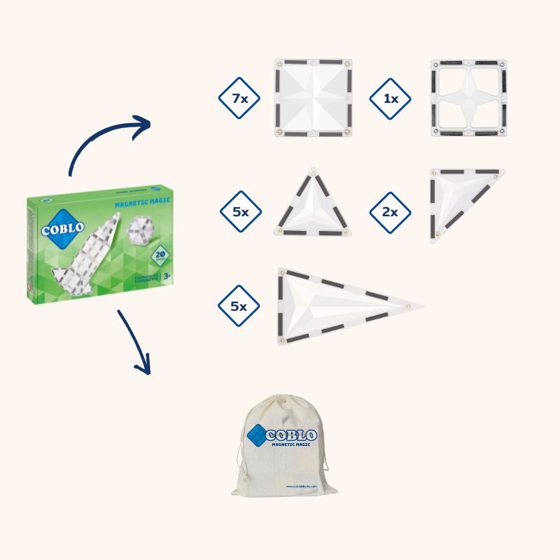 Deze bouwset bestaat uit 20 transparante magnetische bouwblokken in verschillende vormen. Door de magneetjes in de stenen, klikken kinderen deze makkelijk zelf aan elkaar. Met deze transparante stenen creëren kinderen een compleet andere wereld zoals een bevroren kasteel of mooie ijskristallen.